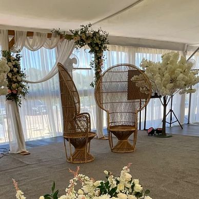 Pair of Peacock Chairs perfect for the new couple to sit on to claim their status. Great opportunity for photos, high standard woven wicker with padded cushion for comfort.
